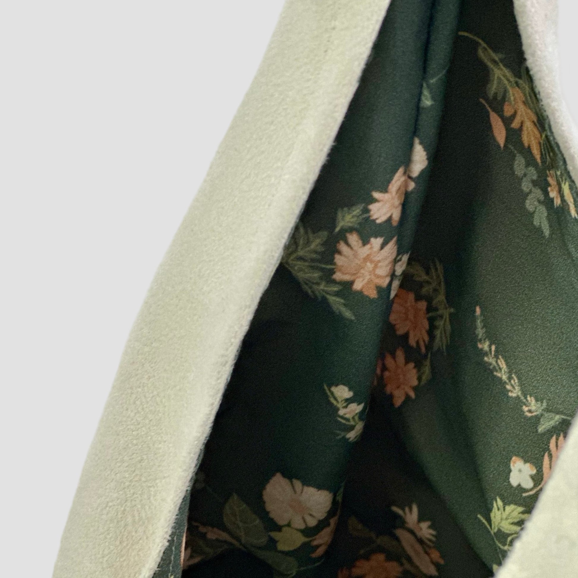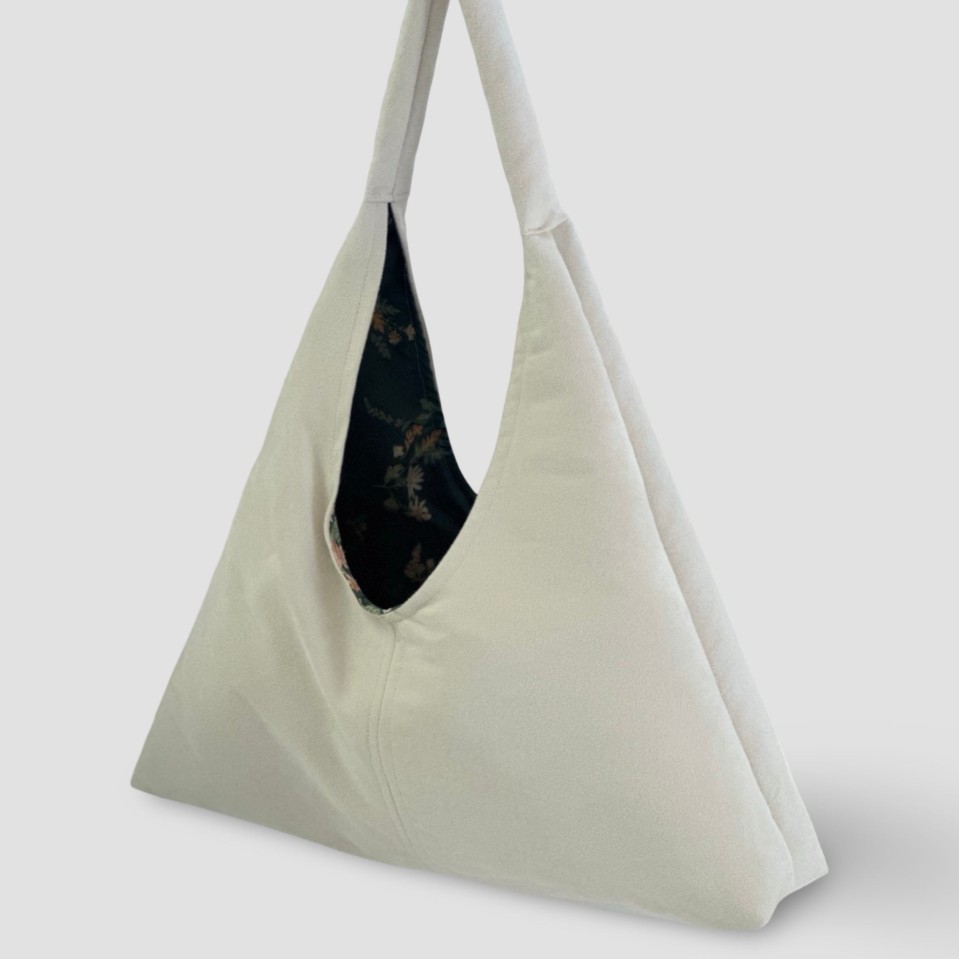 This minimalist bag features a slouchy design and a soft, delicate texture. Made of durable microsuede, this bag easily holds all your essentials - tablet, books, cosmetics, and more! The wide strap ensures comfortable carrying, and the magnetic closure provides safe and easy access. Finished with a lining made of organic cotton with a beautiful floral print, and available in colors to match any outfit.